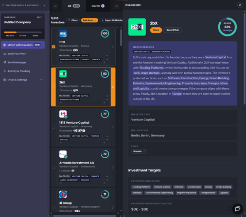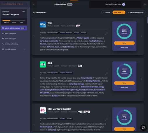 Each investor match includes a score, contact information, and a detailed explanation of why they’re a good fit.