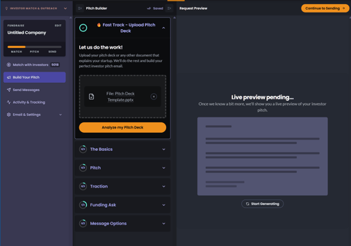 Click Analyze my Pitch Deck to allow the AI to generate personalized outreach templates and improve match accuracy.