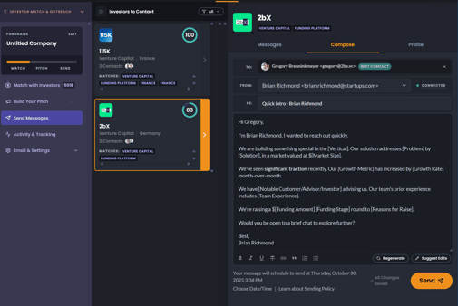 After reviewing matches, continue through the workflow to to start automatically building your pitch email, and then send it directly to investors.